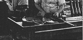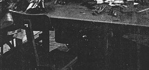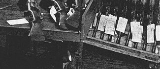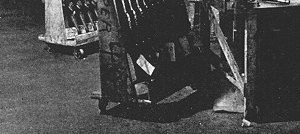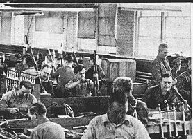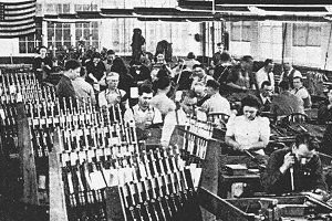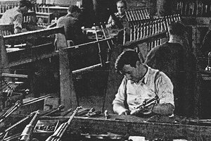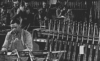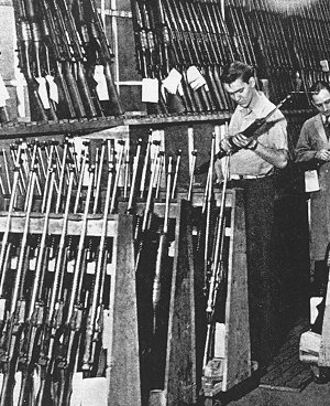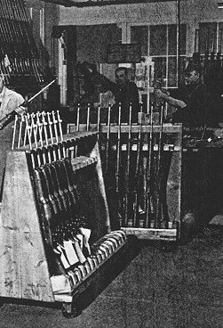 stacked onto wheeled racks - note the progress report card on each rifle.